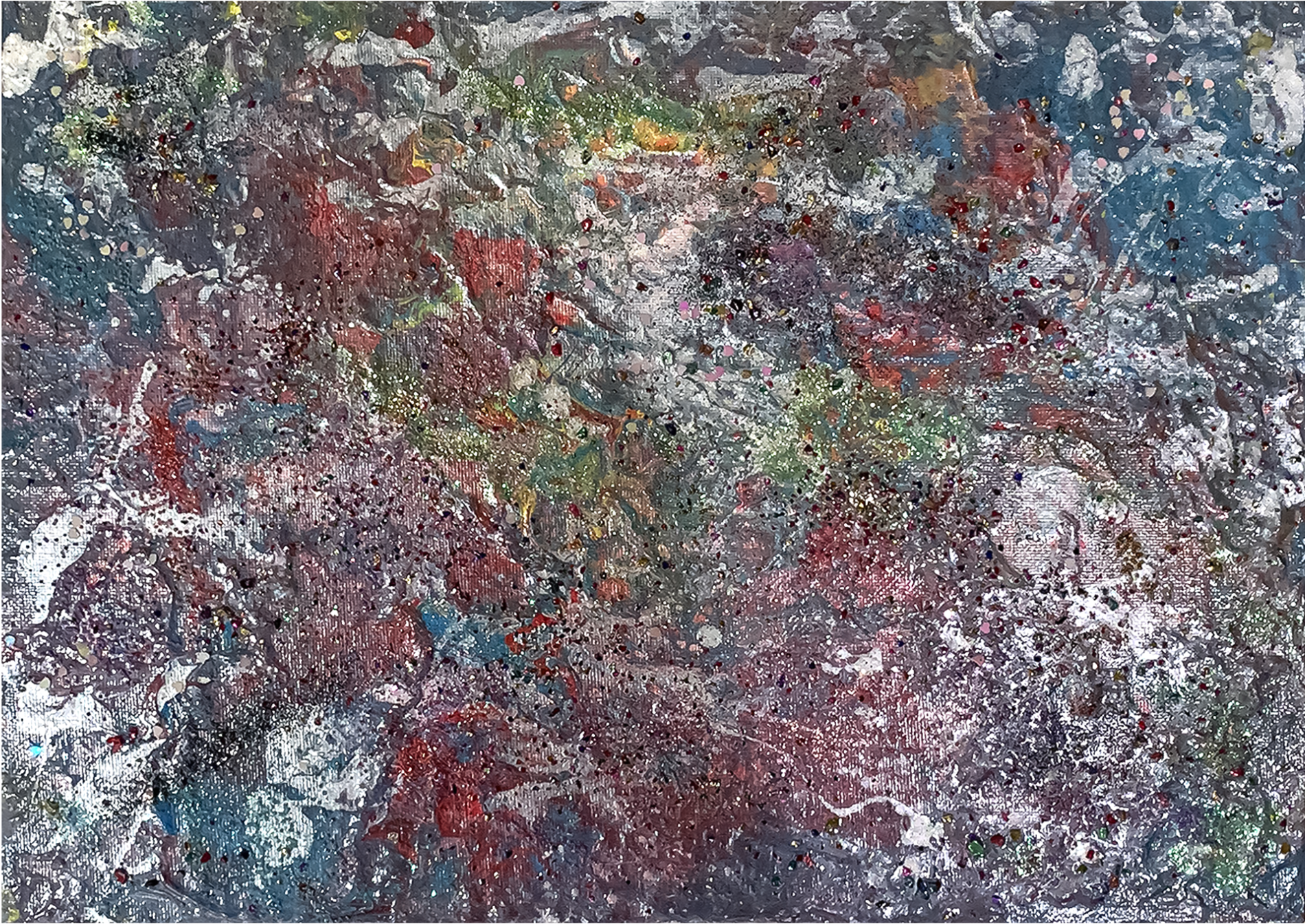 Technique mixte: acrylique fluide, mini-boules décoratives, brillants décoratifs, mini-roches colorées, vernis polyuréthane brillant.